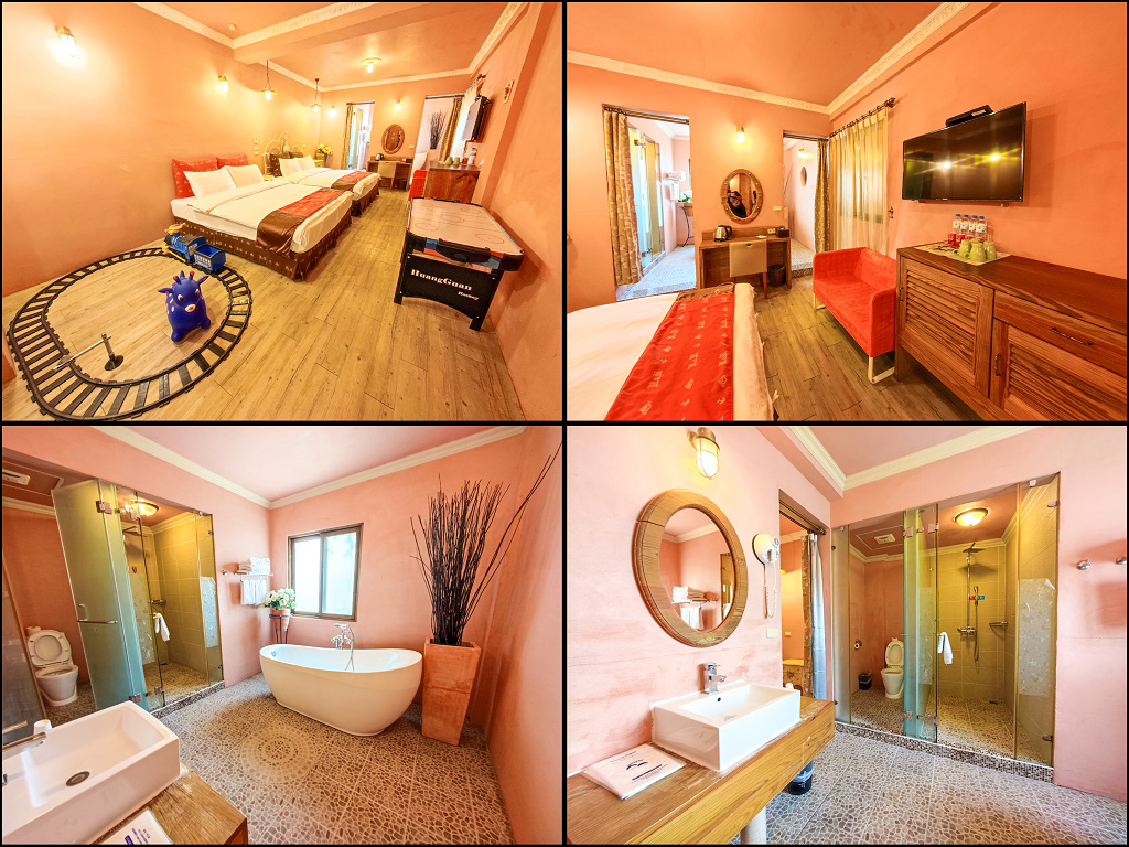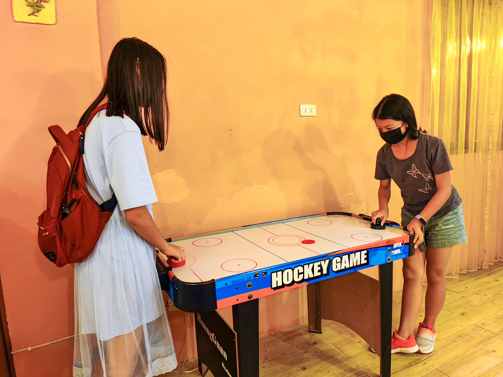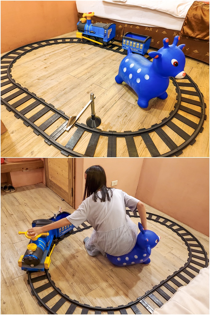 #77 第二晚的「冰球桌房」,有1台冰球桌(配件押金200元,退房時退還)、1台小火車、1隻跳跳馬,兩大床的房型對我們家目前的情況比較難睡一點,因為孩子漸漸長大了,還好是加大雙人床,所以還OK。