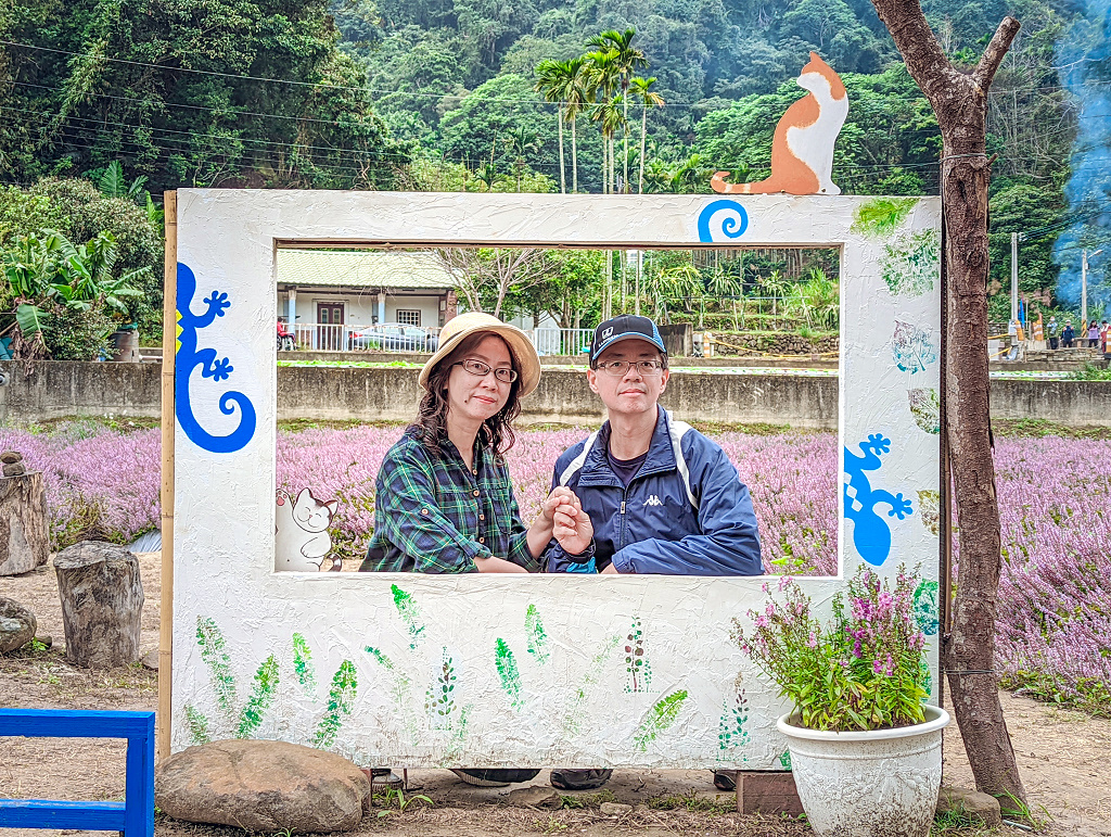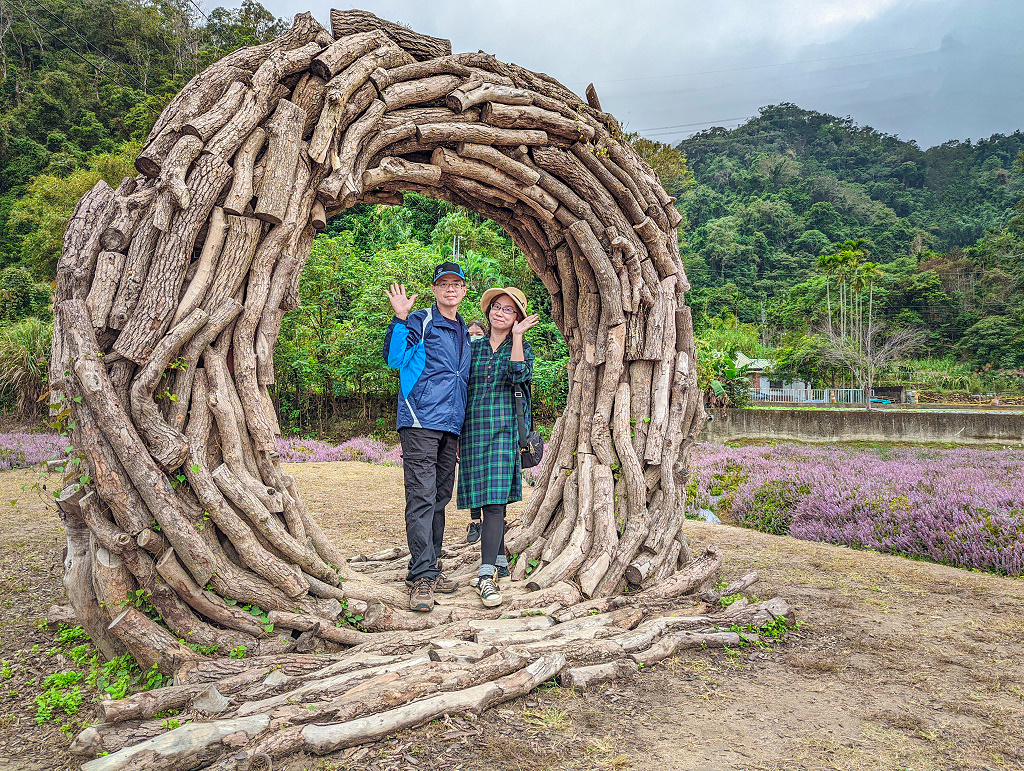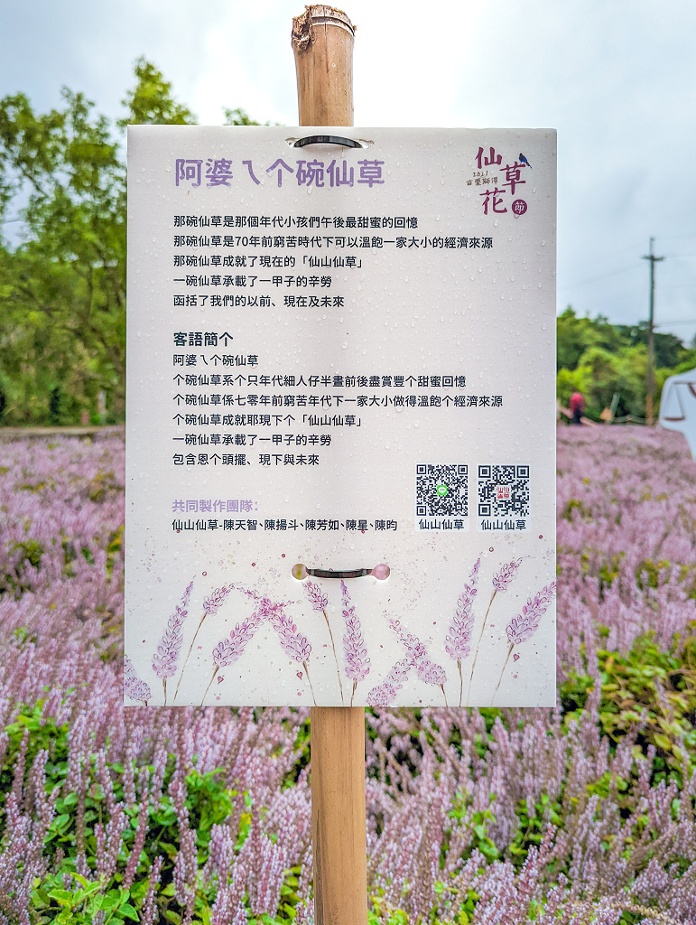 今年苗栗縣獅潭鄉公所首次舉辦「2021獅潭仙草花節」,地點就在獅潭義民廟停車場旁花田。除了欣賞紫色仙草花海繽紛綻放之外,更結合在地青年創作的藝術作品,展現獅潭的在地特色,這次共展出4件作品,分別有裝著滿滿仙草凍的「阿婆ㄟ个碗仙草」、展現獅潭風情的「山居歲月」、獅潭青農創作的「轉屋。豐收」以及「漫遊獅潭•花時光」,讓前來探訪的遊客除了享受徜徉在浪漫花海中,還能打卡拍照更了解獅潭。