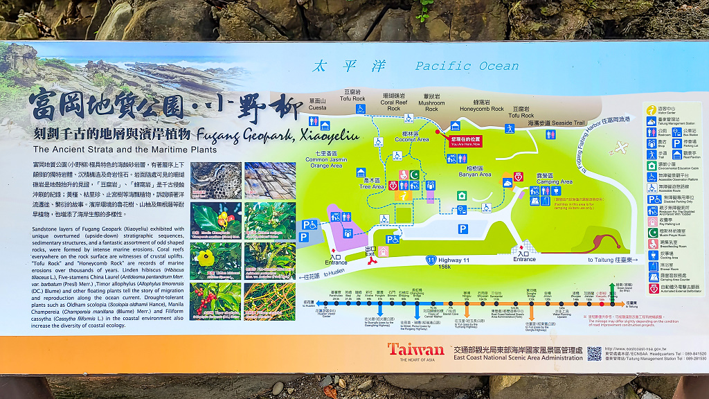 富岡地質公園(小野柳)位於富岡漁港北方的海域,是東部海岸最南端的風景據點,因地形和岩石在種類與北海岸的野柳相似,因此被稱為「小野柳」。園區內設有遊客中心、賣店、露營區與海邊步道等,來到這裡除了欣賞不同類型的奇岩怪石、觀海聽浪、賞魚戲水之外,天氣晴朗時更能眺望約33公里外的綠島。