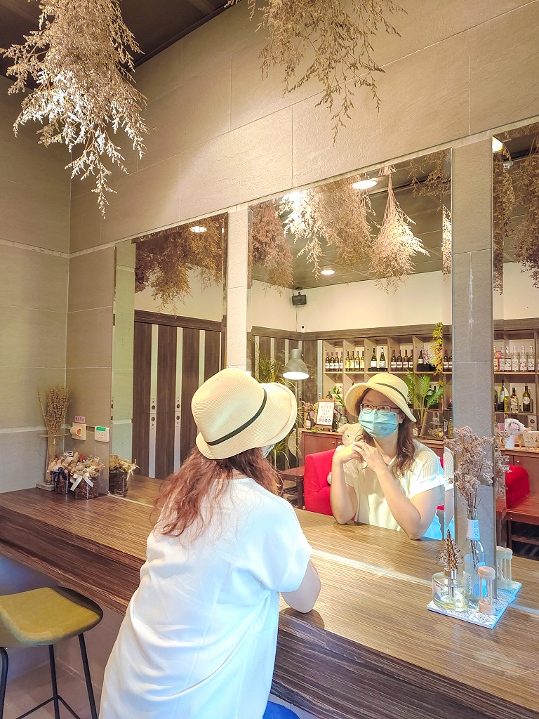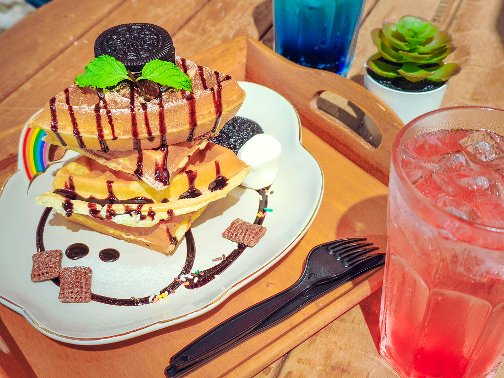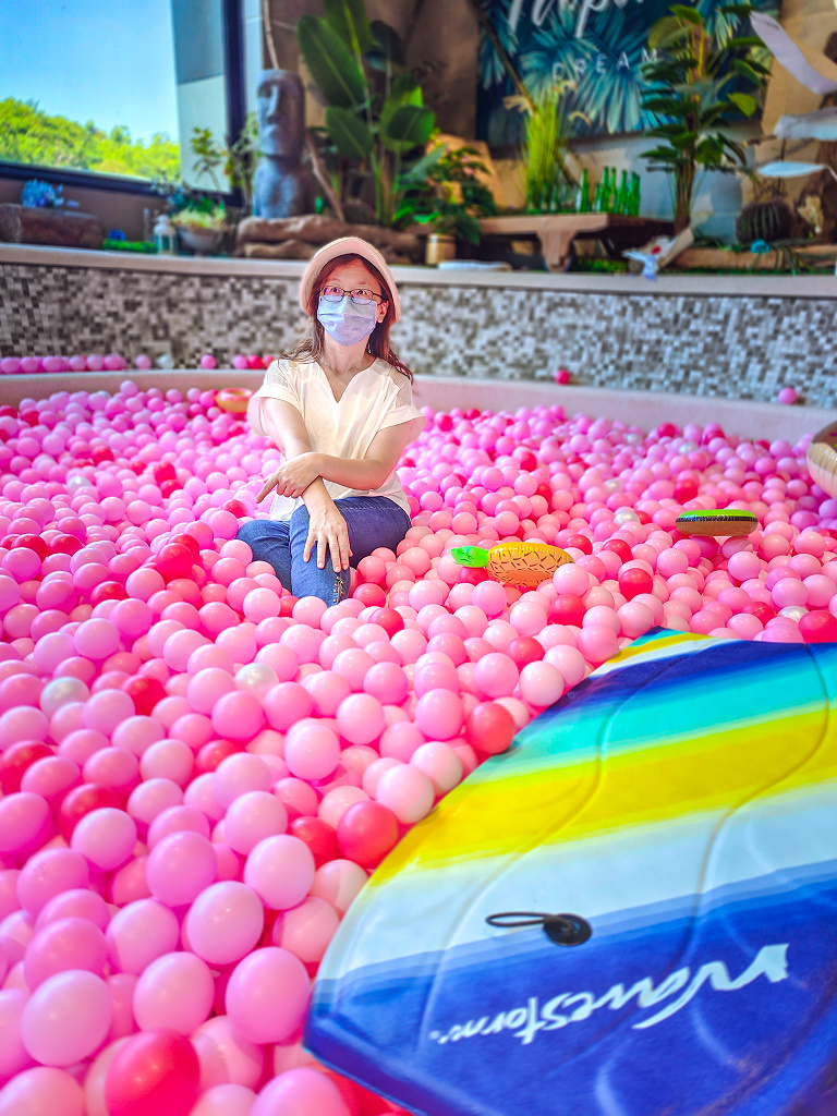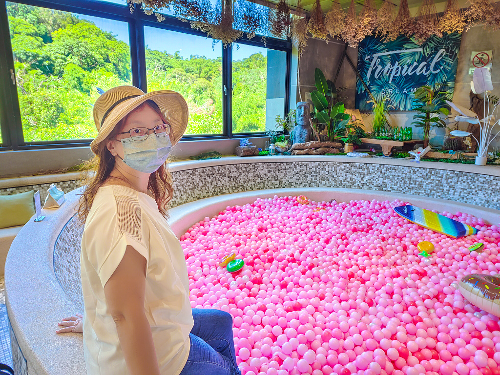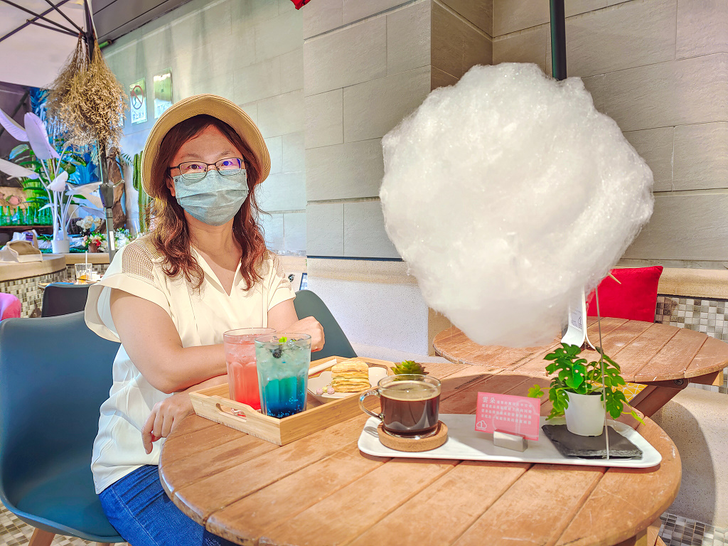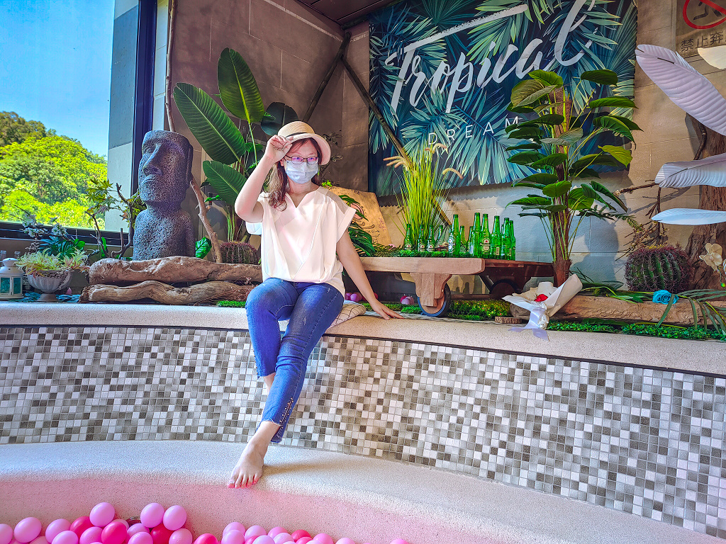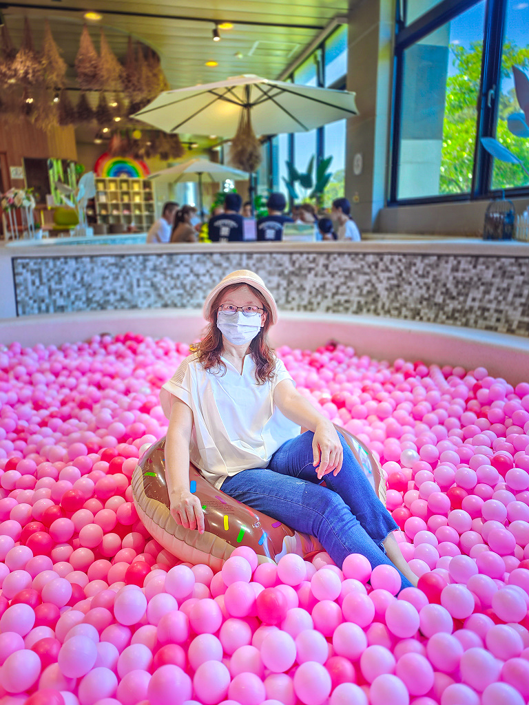 餐廳入口處就有適合拍照的野餐風造景,內部空間更是讓人驚豔,SPA池重新舖上新穎的馬賽克磁磚,變身為夢幻球池,周邊使用乾燥花、綠色植栽與彩色桌椅,形成獨特的用餐空間。這裡的餐點以輕食為主,有鬆餅、炸物小點、甜點與各種飲品,低消一杯飲品或套餐,國小以下免低消(用餐空間有限,強烈建議先預約)。