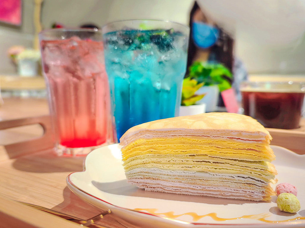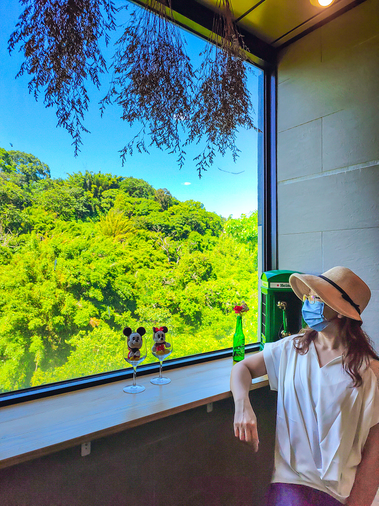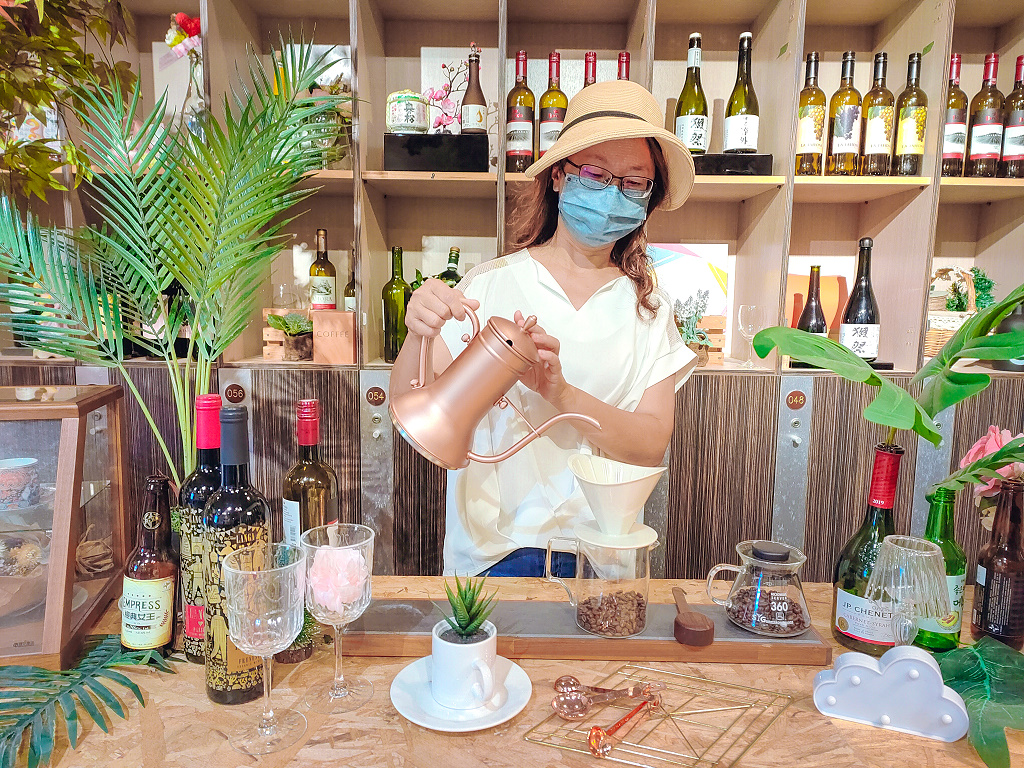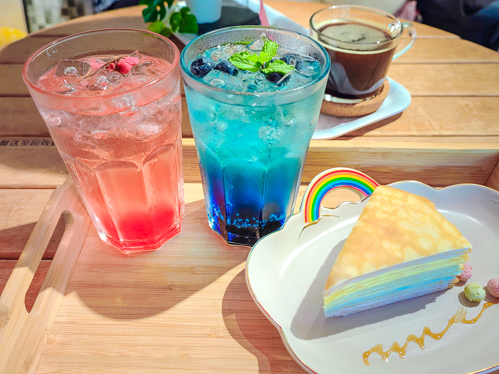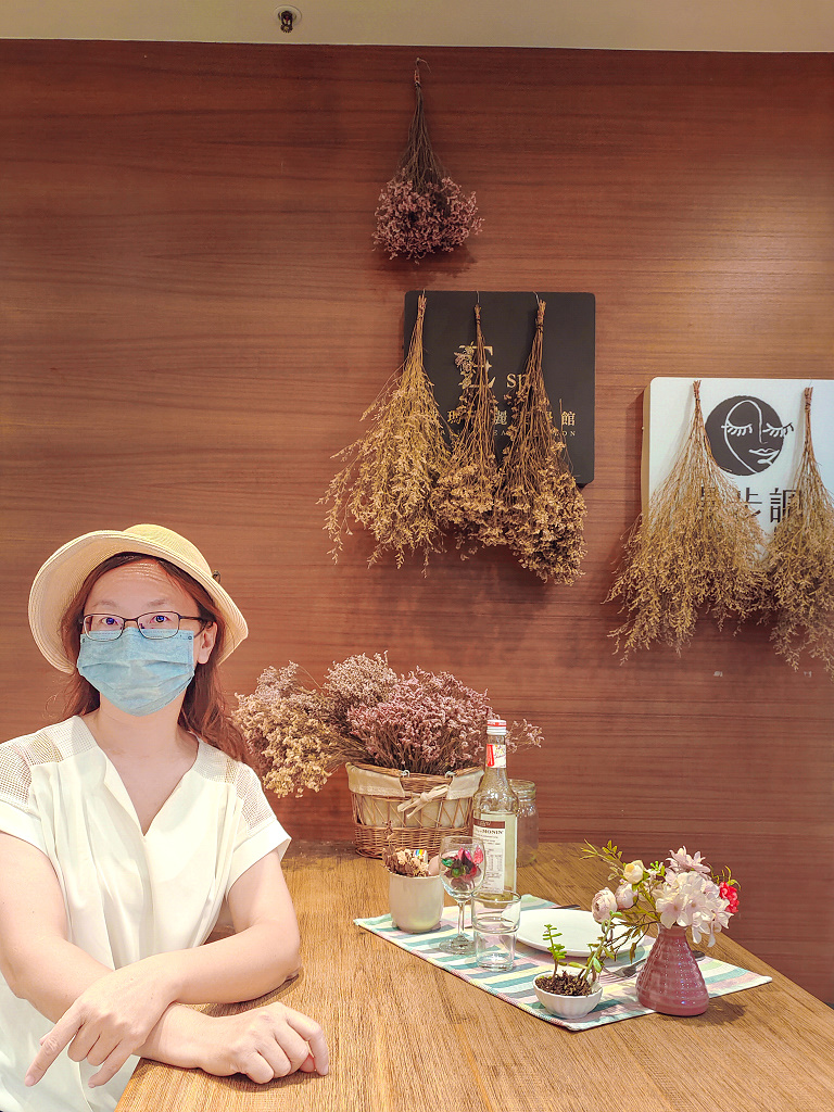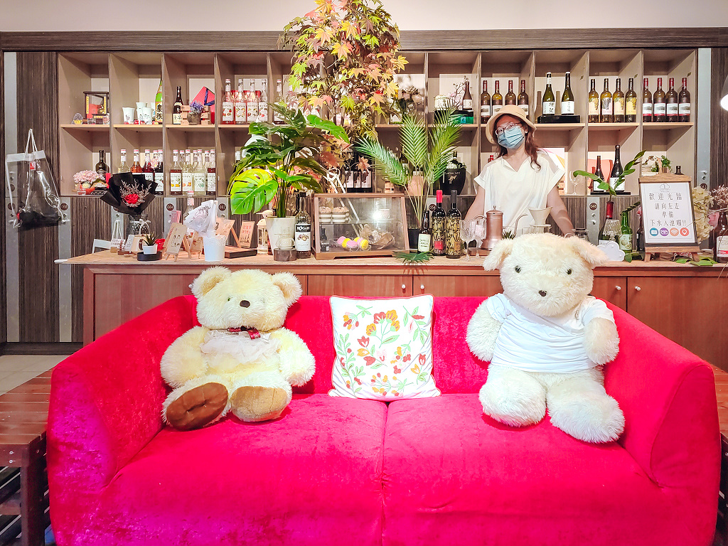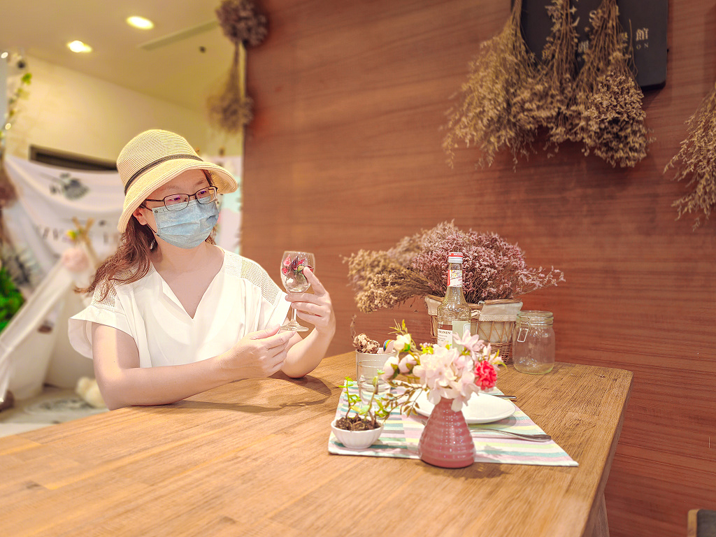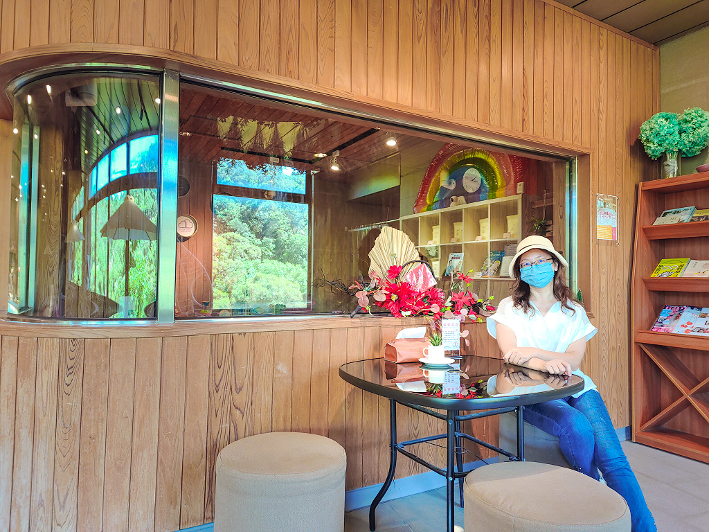 餐廳入口處就有適合拍照的野餐風造景,內部空間更是讓人驚豔,SPA池重新舖上新穎的馬賽克磁磚,變身為夢幻球池,周邊使用乾燥花、綠色植栽與彩色桌椅,形成獨特的用餐空間。這裡的餐點以輕食為主,有鬆餅、炸物小點、甜點與各種飲品,低消一杯飲品或套餐,國小以下免低消(用餐空間有限,強烈建議先預約)。