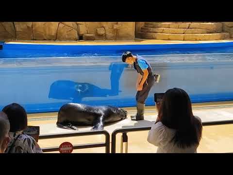 #13 海豹正在進食,水槽上面有工作人員餵魚。