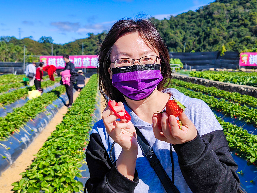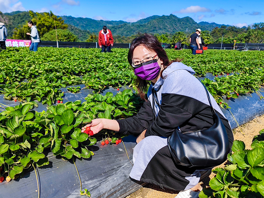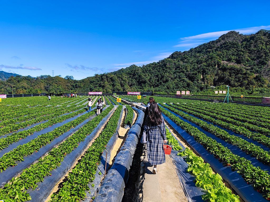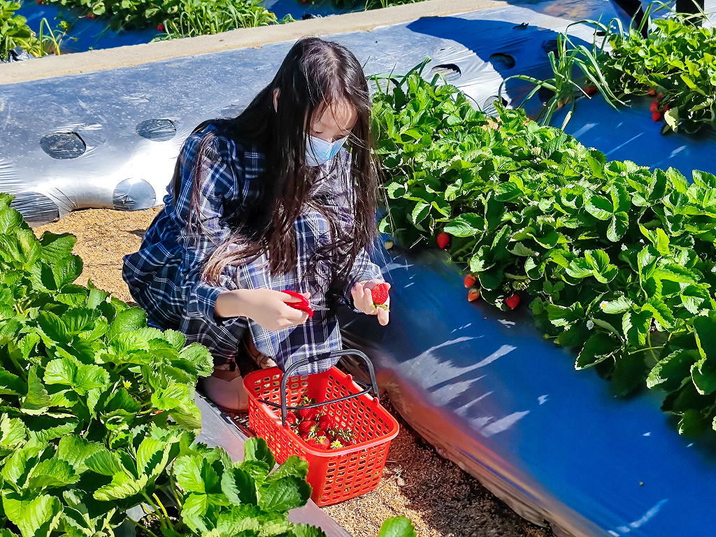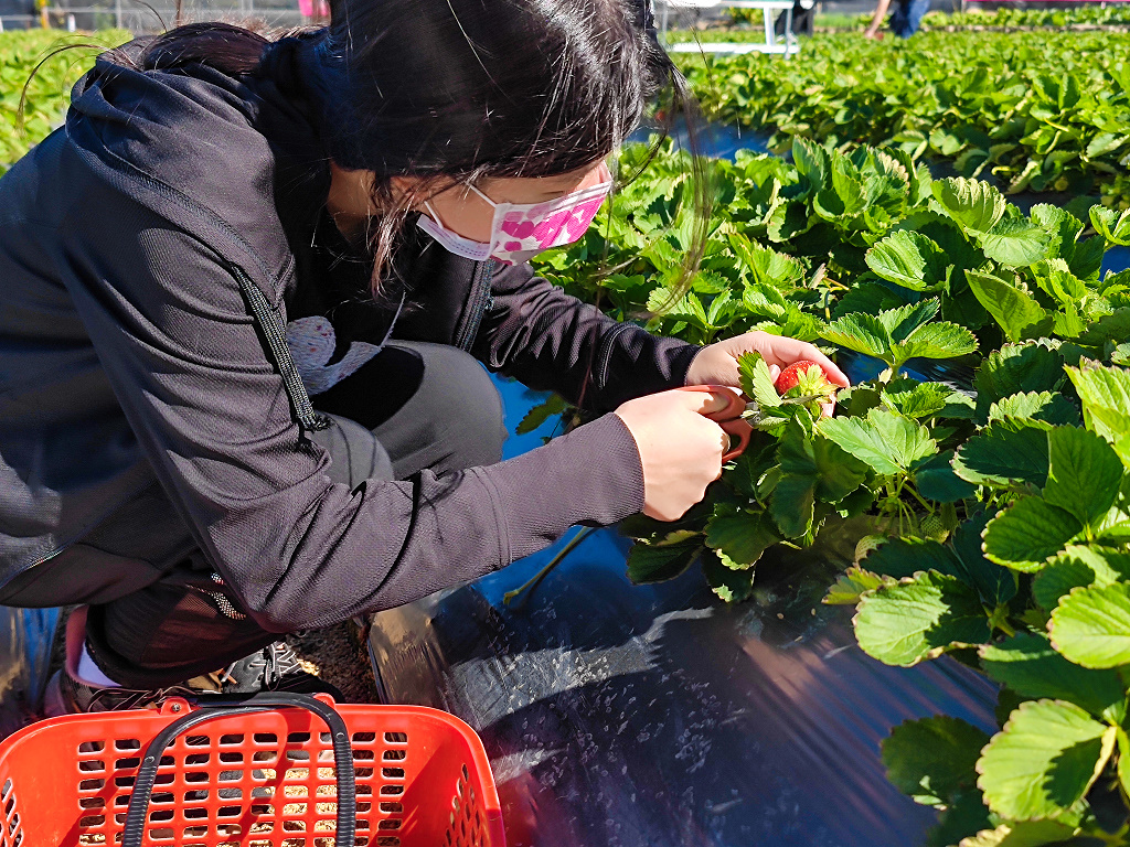今天天氣實在太棒了,氣候涼爽,冬陽暖暖地照在身上,在一大片草莓園中仔細尋找自己喜歡的草莓,一整個超療癒的感覺!