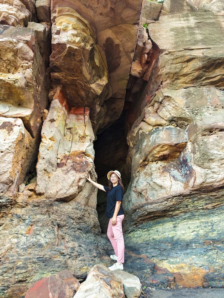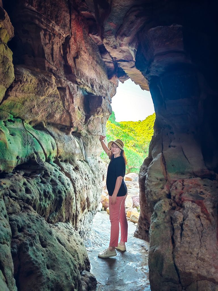 前往神秘海岸必須先穿過一個隱密海蝕洞,又被稱為「一線天」洞裡幾乎無法會身,一次只能一個人通行。穿過一線天之後回頭看,原來洞穴竟是如此巨大的岩壁,層層堆疊令人讚嘆大自然的鬼斧神工!