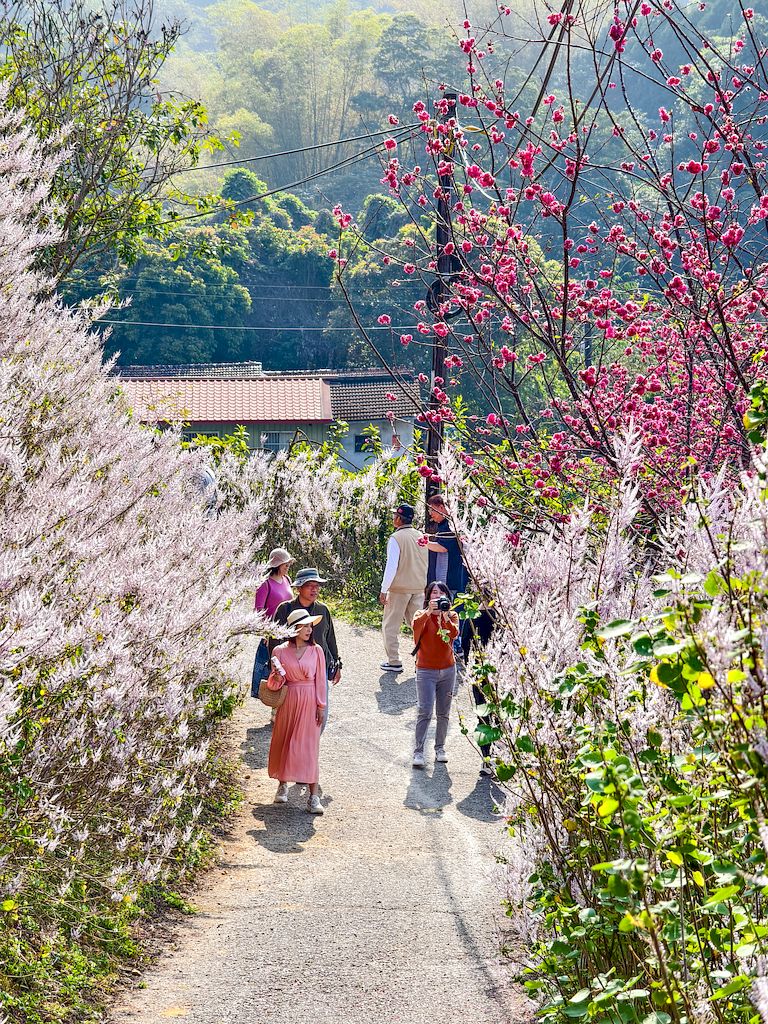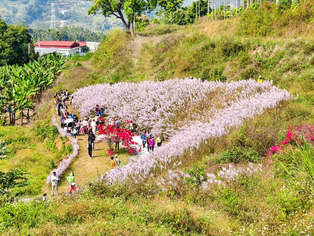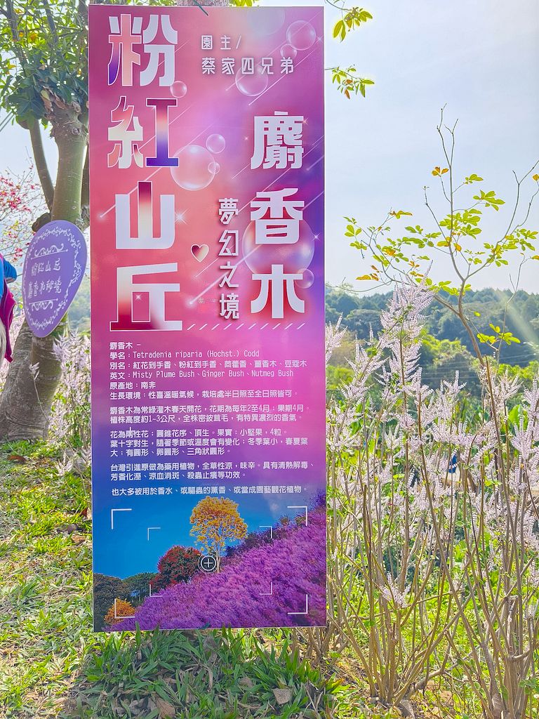 全台最大最美的「粉紅山丘」就在南投縣中寮鄉,是一座擁有3000坪「麝香木花海秘境」的花園。園主蔡家四兄弟種植了多種觀賞型植物,造有許願藤隧道、九重葛花牆、風鈴木、樹玫瑰等美麗造景,其中以粉紫色的麝香木於初春之際,能開出壯觀美麗的粉紅花丘花海最為著名。