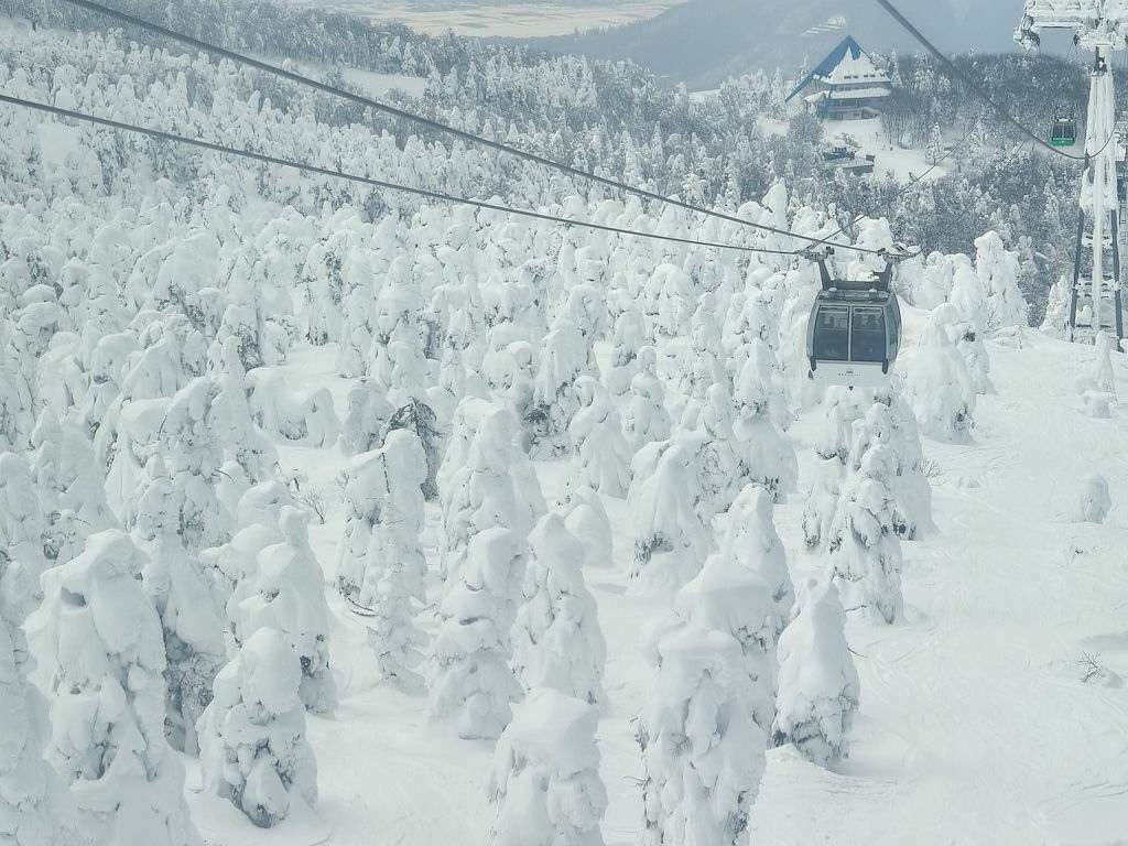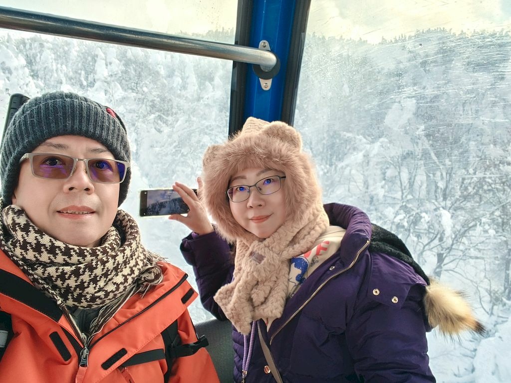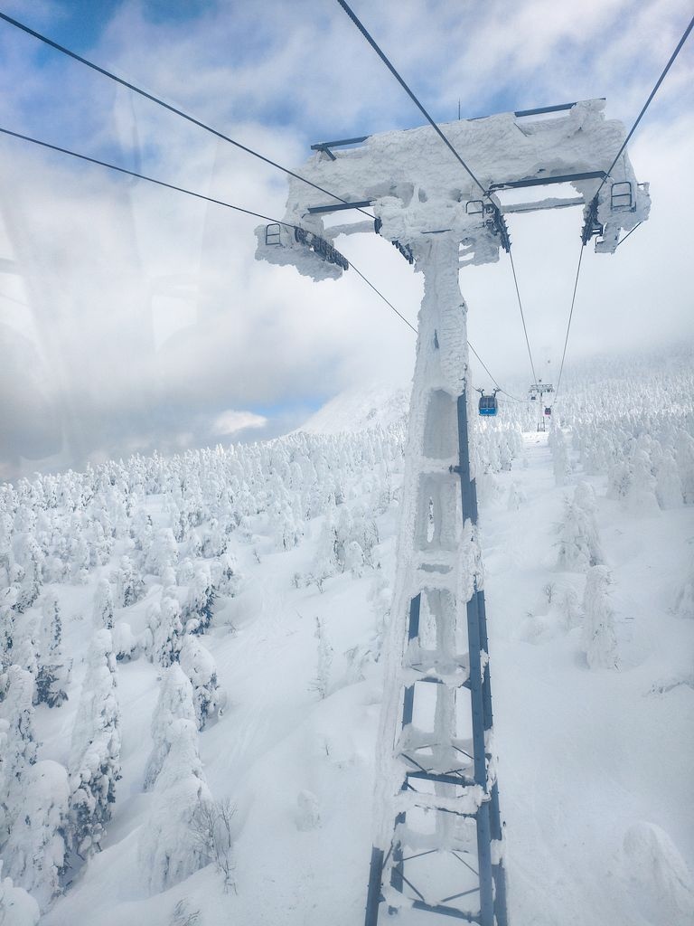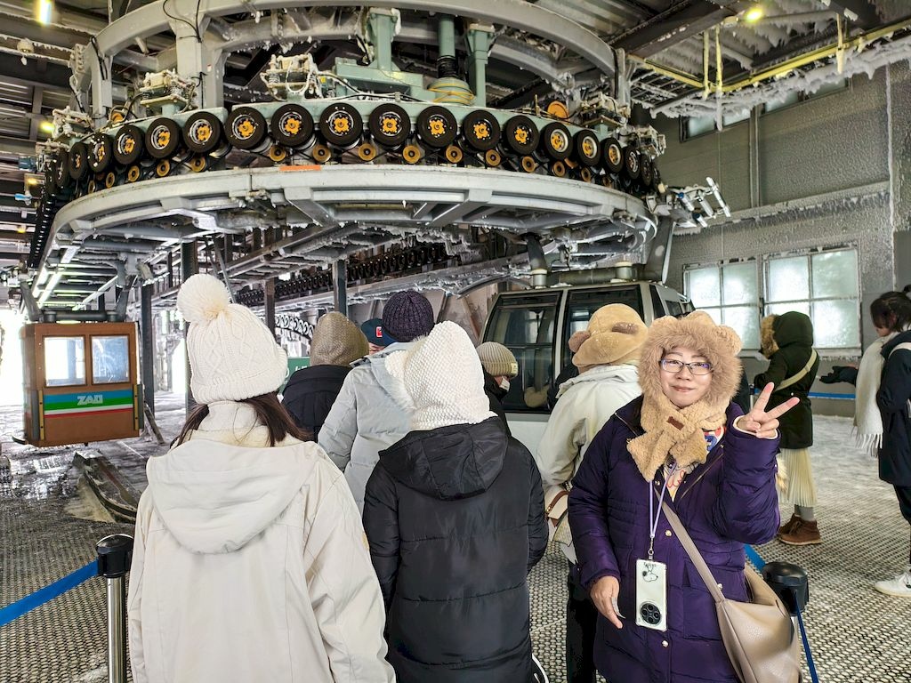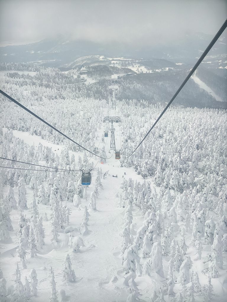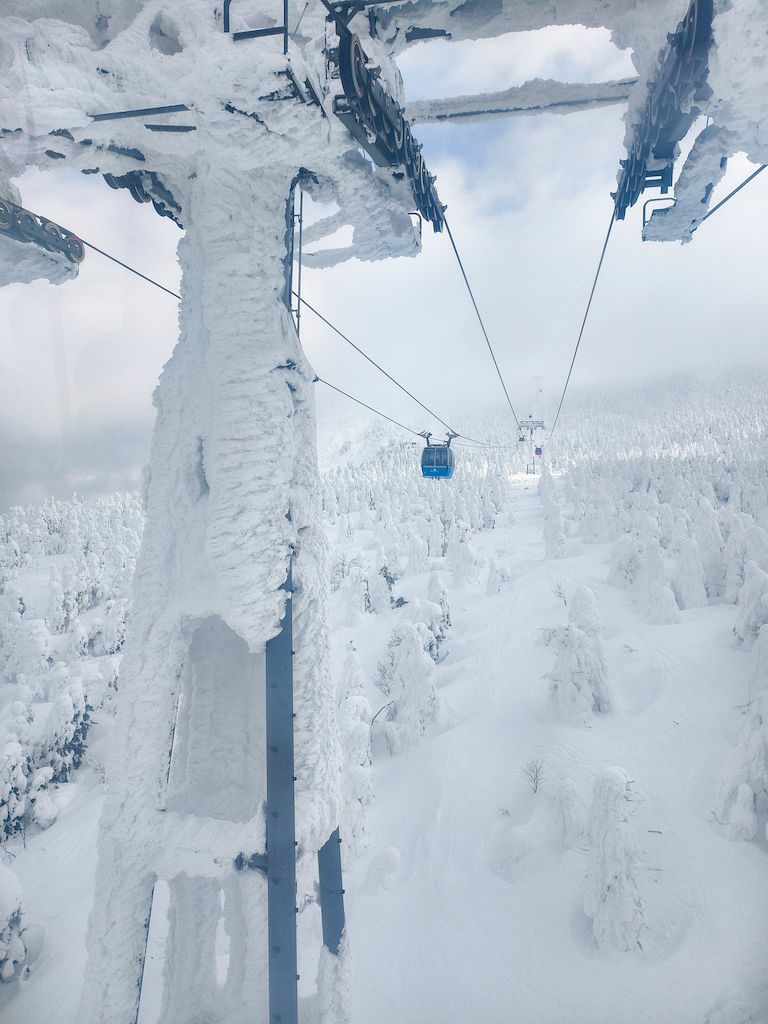 要親眼目睹「藏王樹冰」的真面目需要搭乘纜車,而且是兩段式纜車。在山腳的藏王山麓站搭乘第一段纜車,抵達樹冰高原站後,須再換乘第二段纜車登上最後的地藏山頂站,期間可從車窗俯瞰到整座山峰的樹冰全景,稱為「樹冰原」。纜車一路爬升,從標高855公尺→1331公尺→1661公尺,真的超級無敵冷!