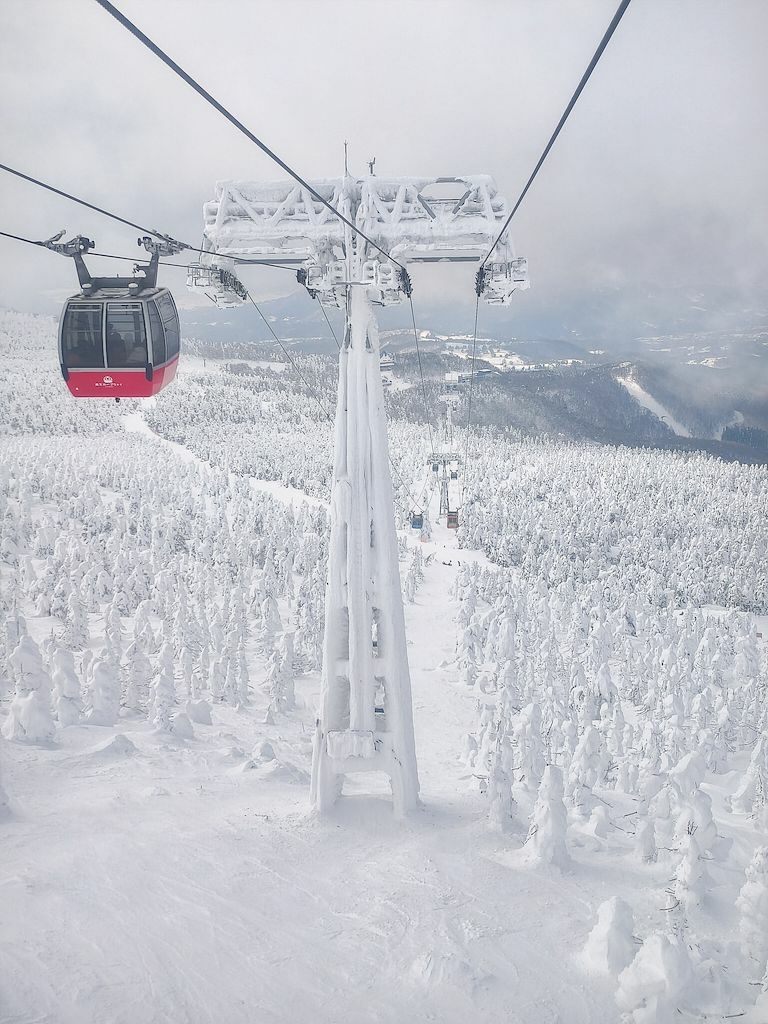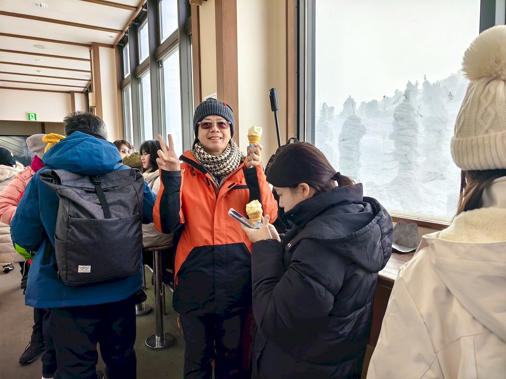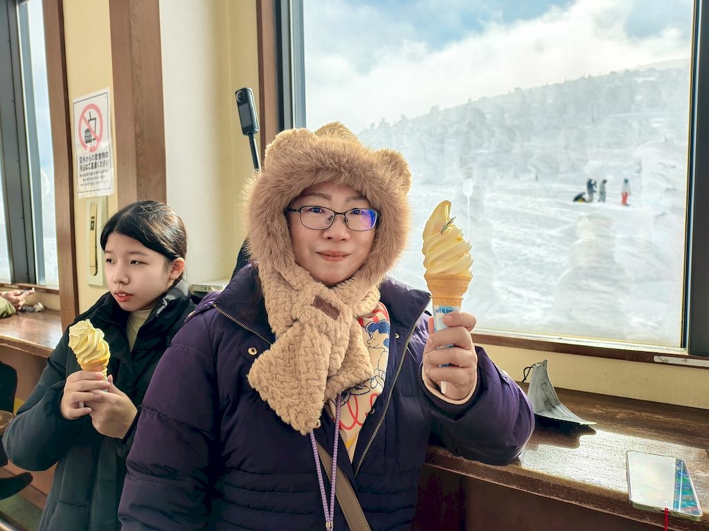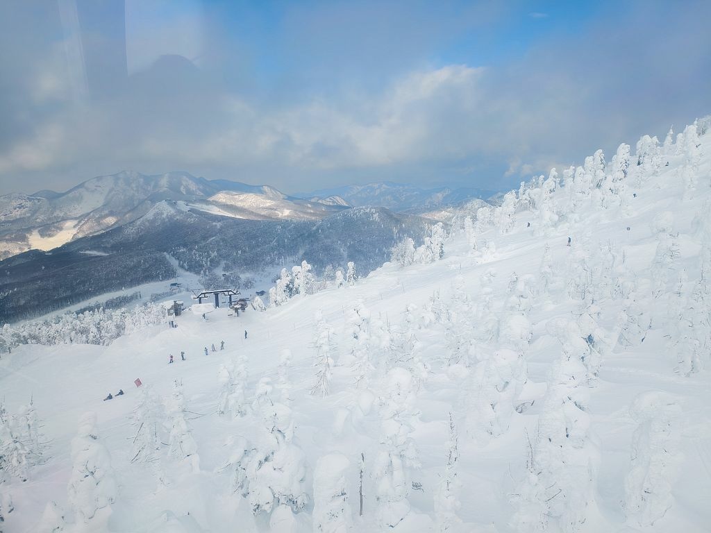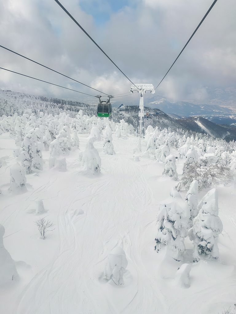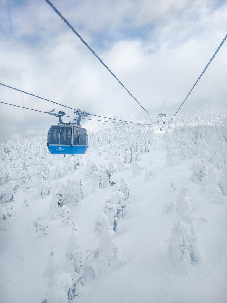 要親眼目睹「藏王樹冰」的真面目需要搭乘纜車,而且是兩段式纜車。在山腳的藏王山麓站搭乘第一段纜車,抵達樹冰高原站後,須再換乘第二段纜車登上最後的地藏山頂站,期間可從車窗俯瞰到整座山峰的樹冰全景,稱為「樹冰原」。纜車一路爬升,從標高855公尺→1331公尺→1661公尺,真的超級無敵冷!