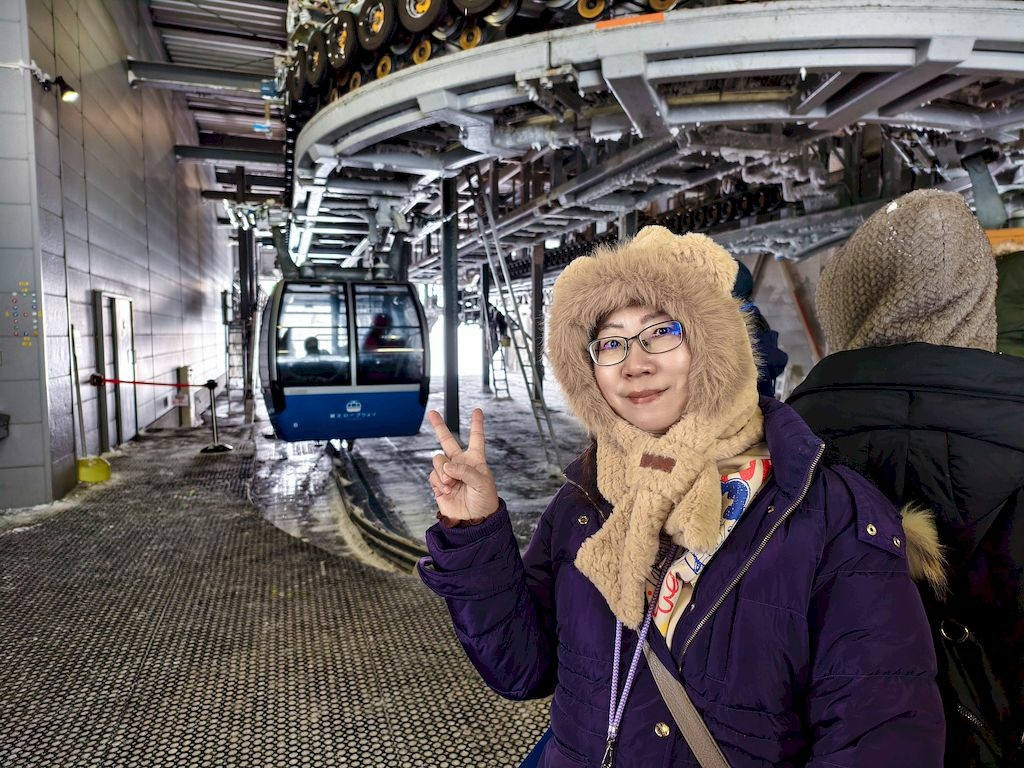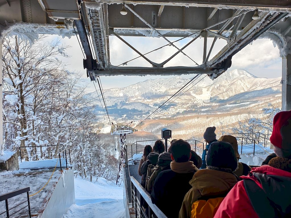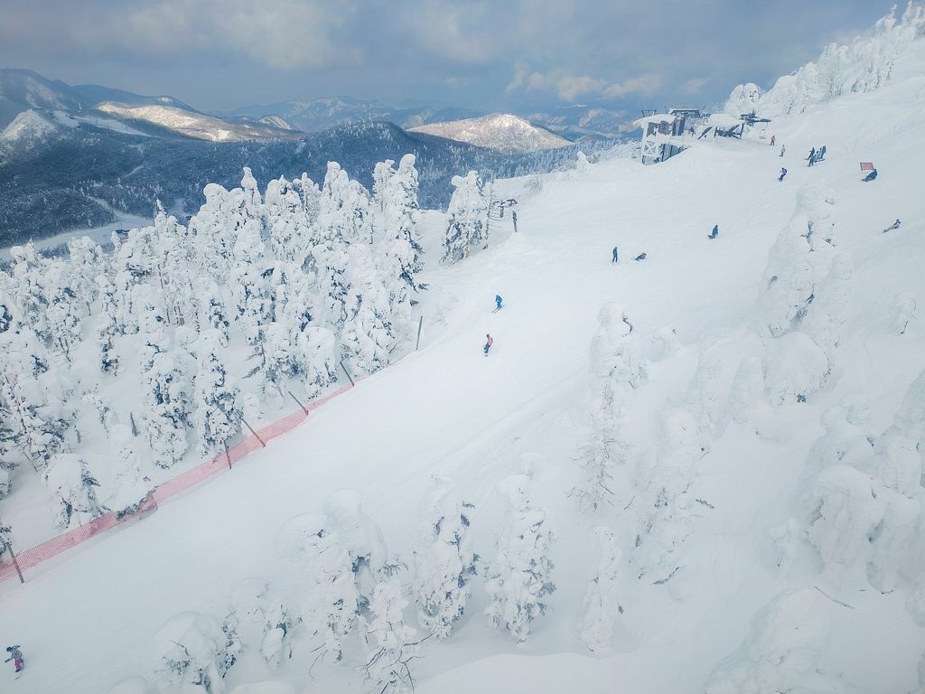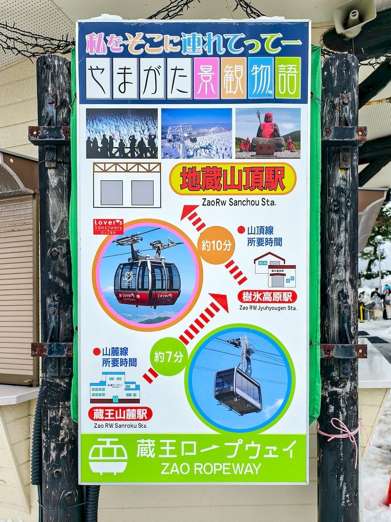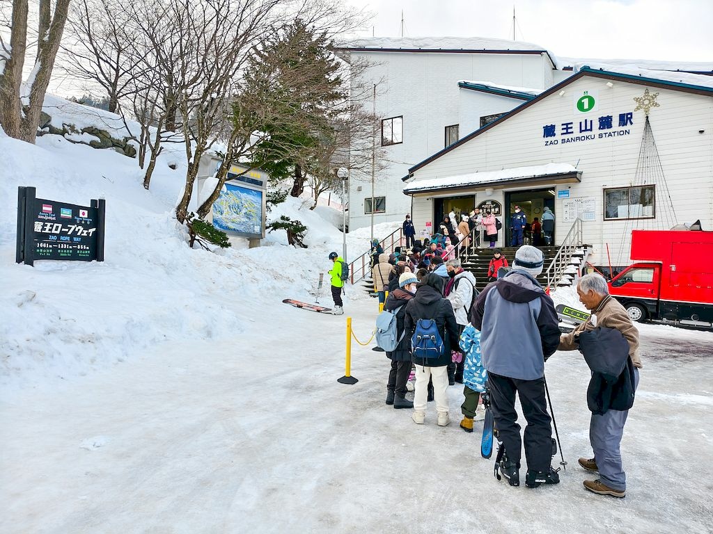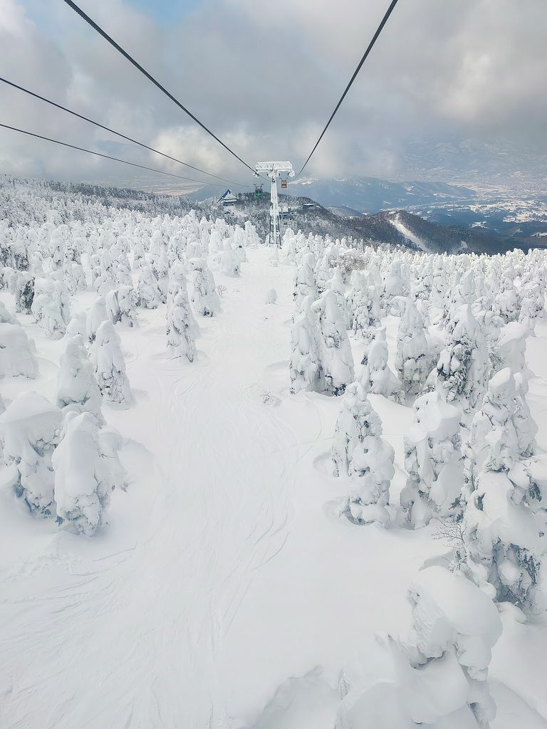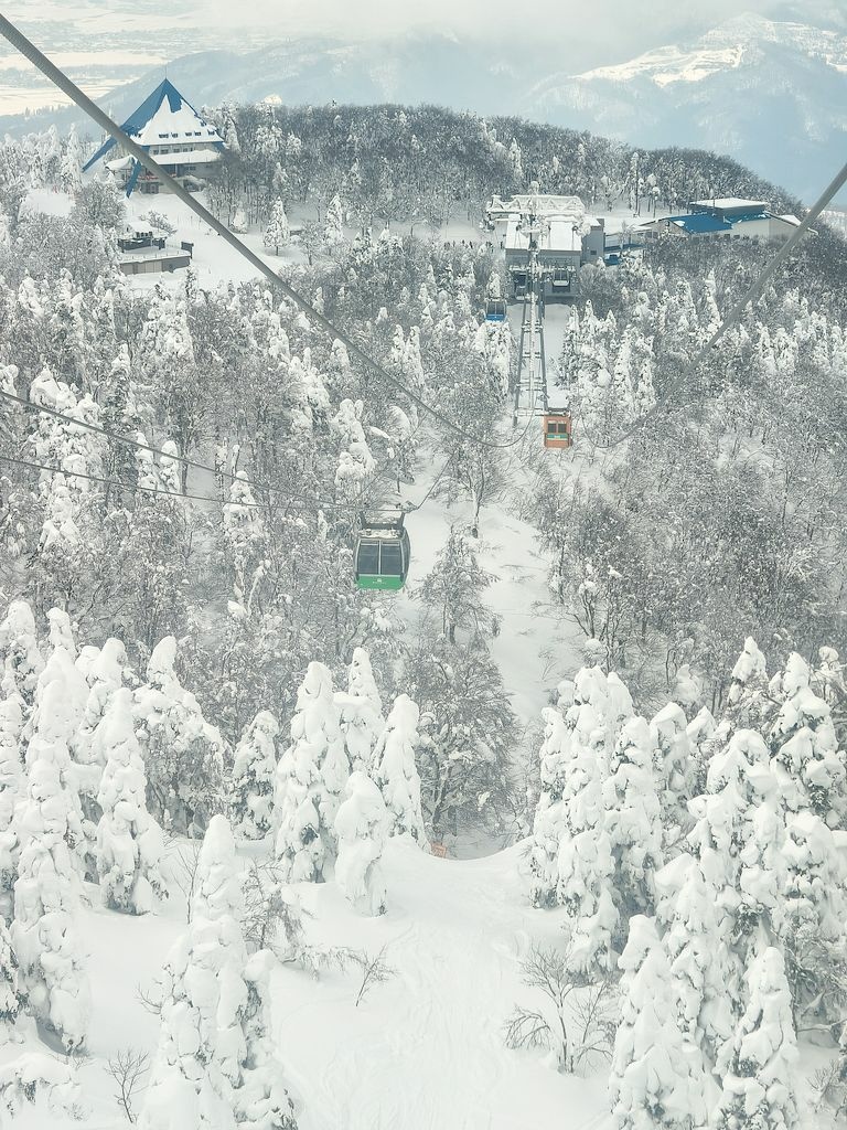 要親眼目睹「藏王樹冰」的真面目需要搭乘纜車,而且是兩段式纜車。在山腳的藏王山麓站搭乘第一段纜車,抵達樹冰高原站後,須再換乘第二段纜車登上最後的地藏山頂站,期間可從車窗俯瞰到整座山峰的樹冰全景,稱為「樹冰原」。纜車一路爬升,從標高855公尺→1331公尺→1661公尺,真的超級無敵冷!