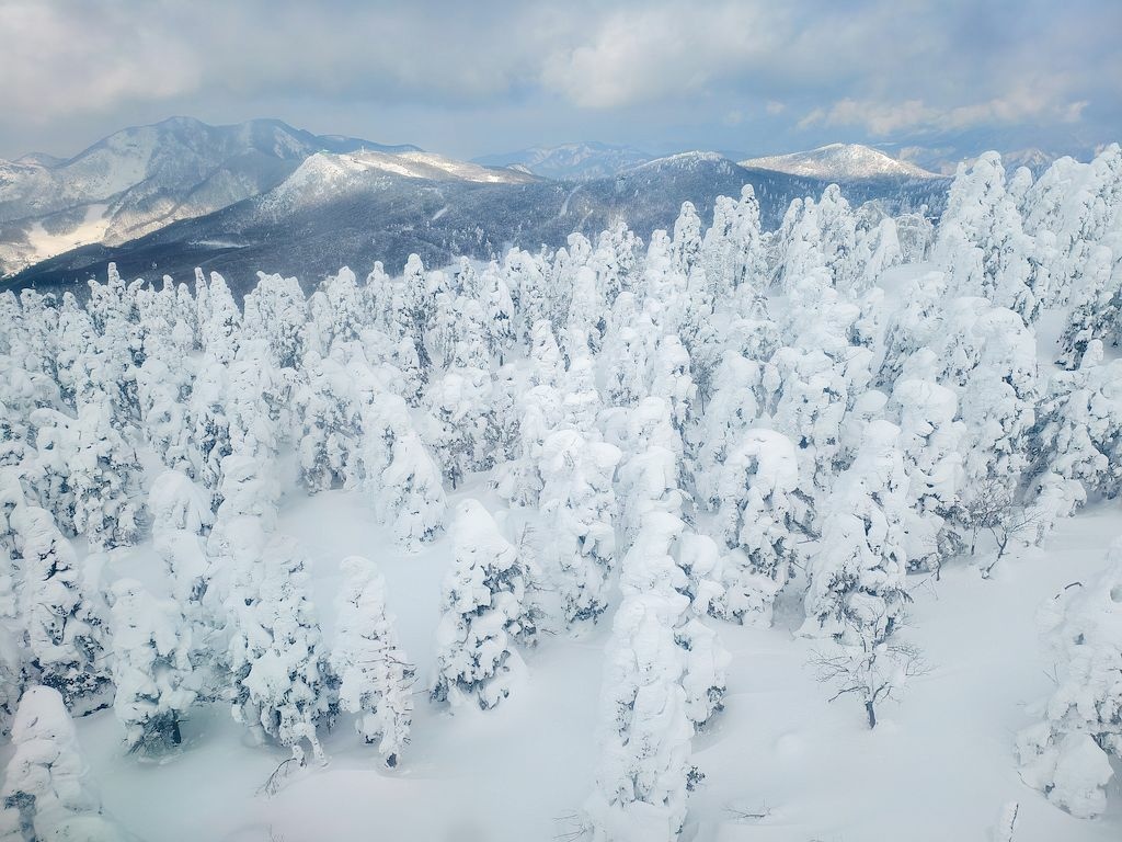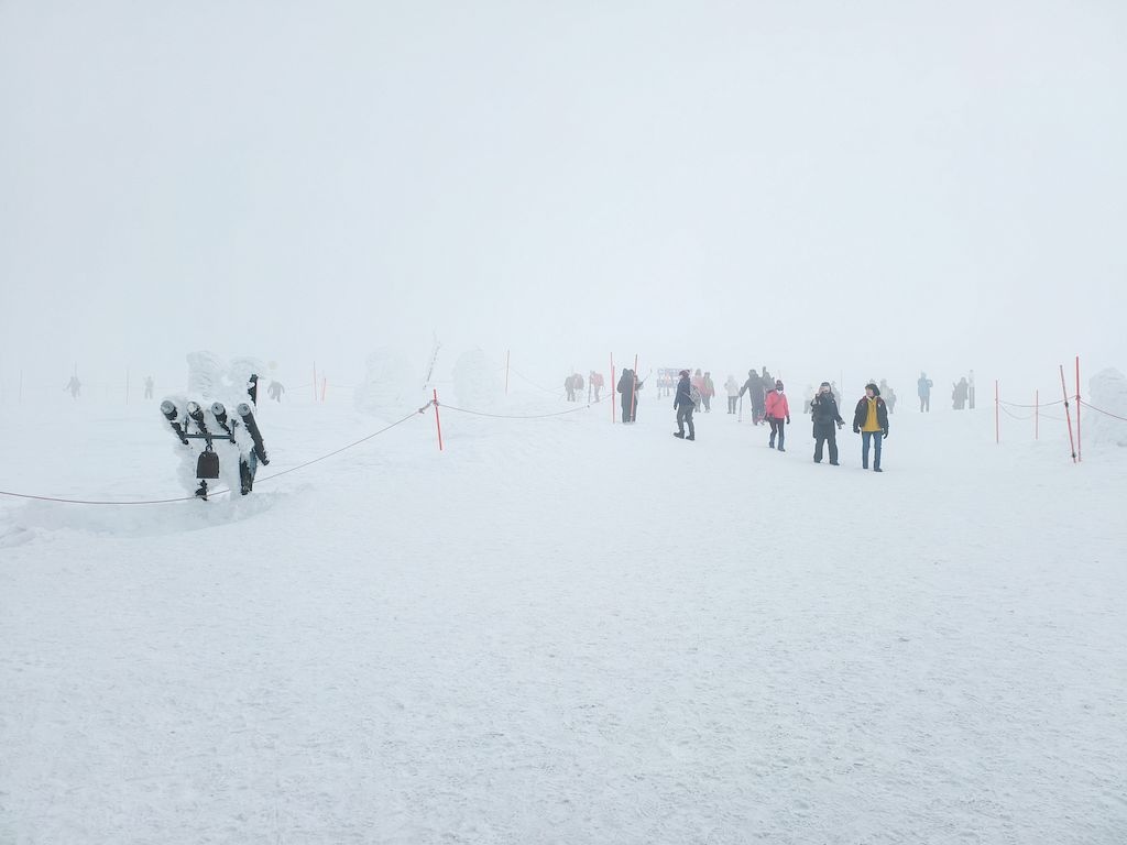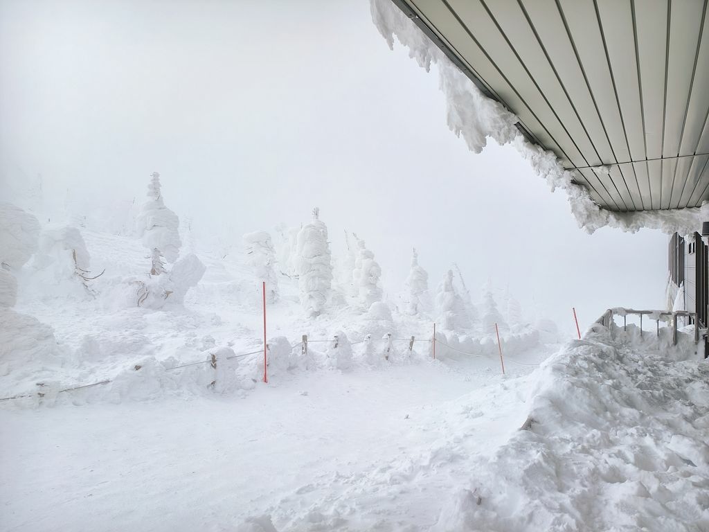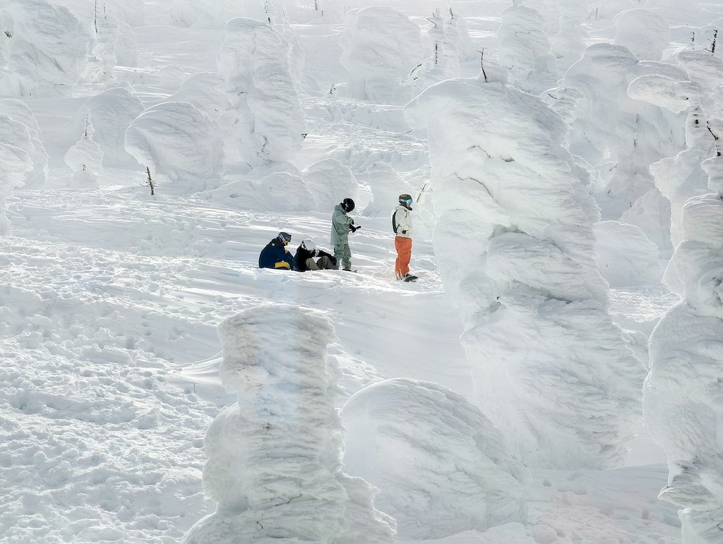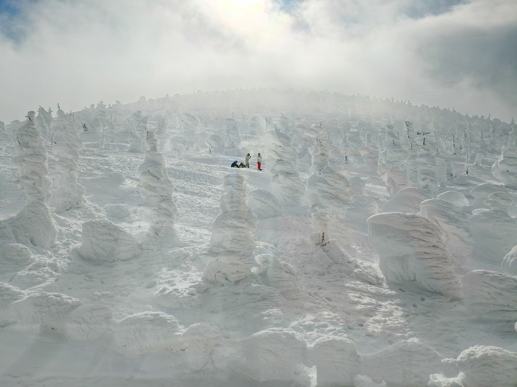再不看就要因為地球暖化而消失的絕景,也是此次日本東北之旅的重頭戲之三!「藏王樹冰」是山形縣藏王冰原上冬季最特殊的自然奇景,大約從每年11月底到12月初開始形成,在此時期雲粒霧粒隨著冬季東北季風被帶來,逐漸在針葉樹上披著冰雪,1、2月期間,藏王冰原原本翠綠的蒼松便完全為白雪包覆,或如人形、野獸,或狀若土地公,形狀千奇百怪,日本民間稱它為「雪怪」。