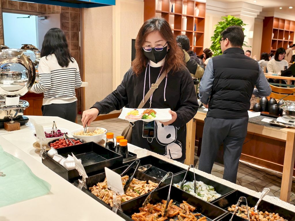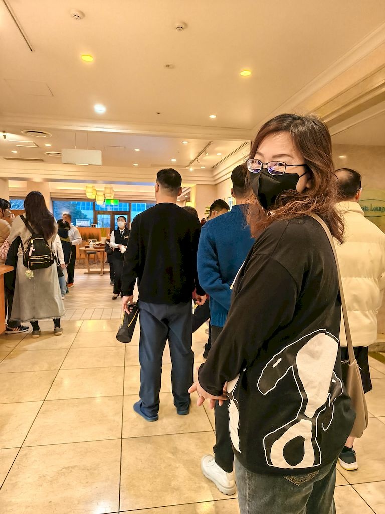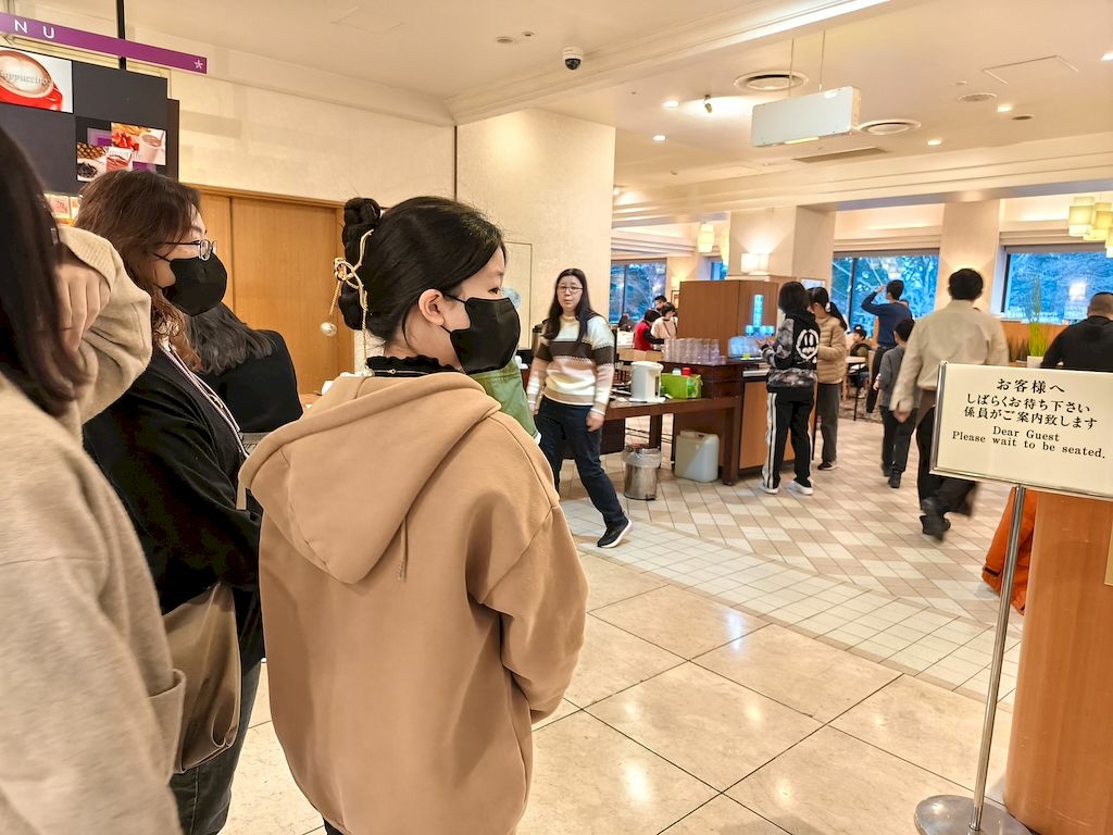 飯店餐廳一早就客滿,大家排隊吃早餐。