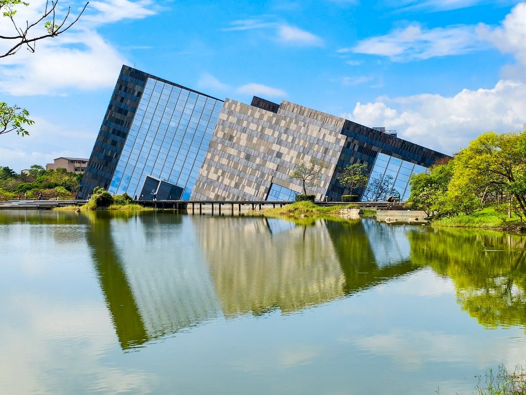 主建物最高頂點朝向東方的龜山島,沿著西南方逐漸下降而沒入地表,整座建物形成三角錐體。建築外牆面直接嵌入土中,模擬巨石挺立的意象,藉由空間錯位,使建物與園區水域的烏石礁相呼應。