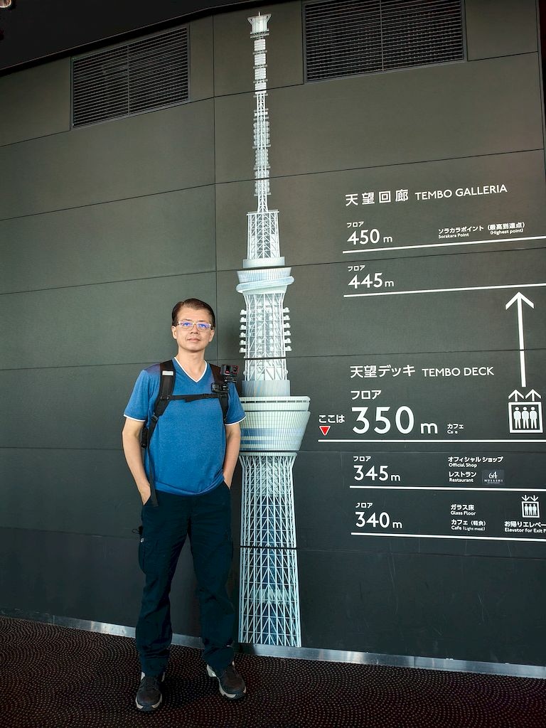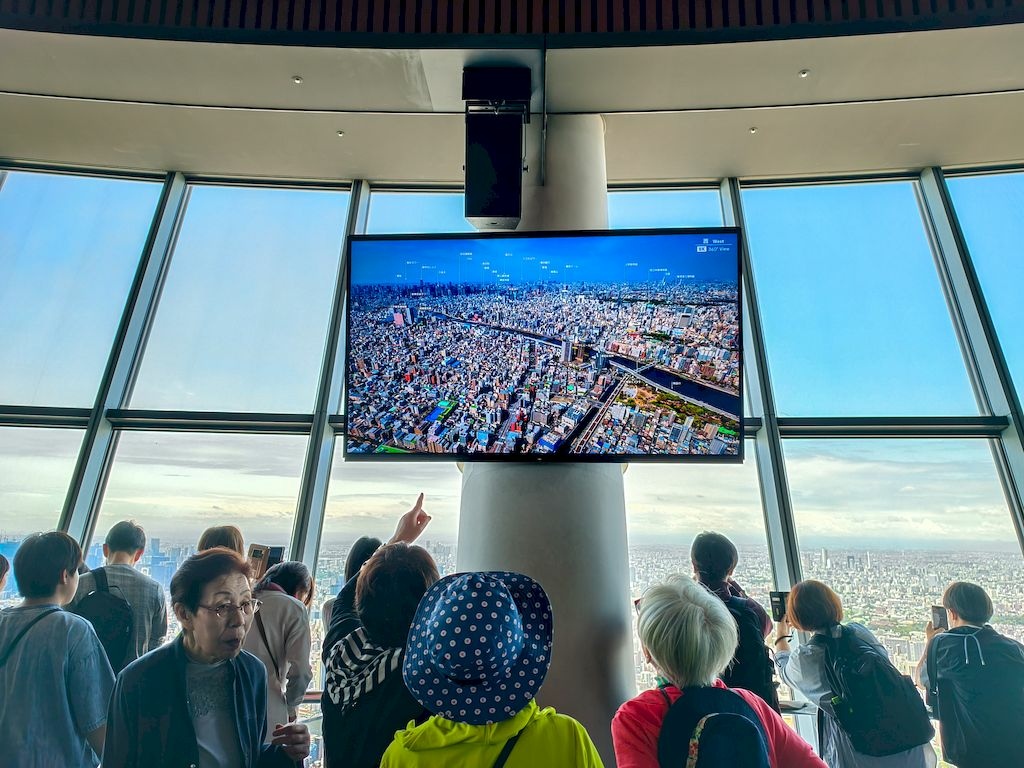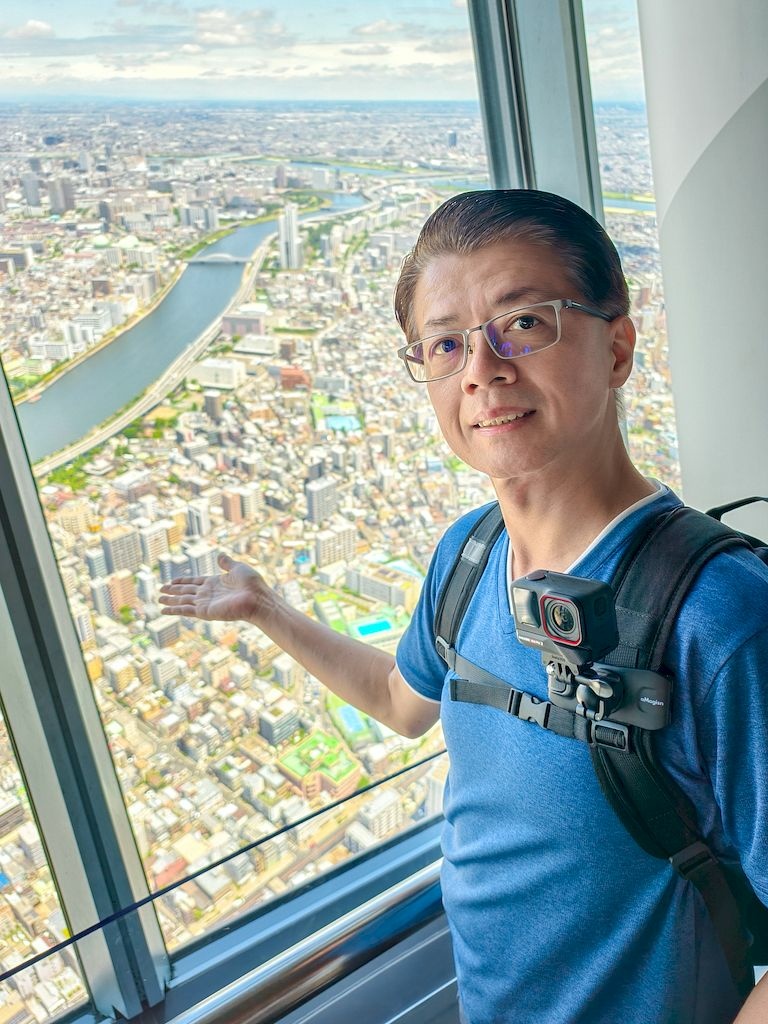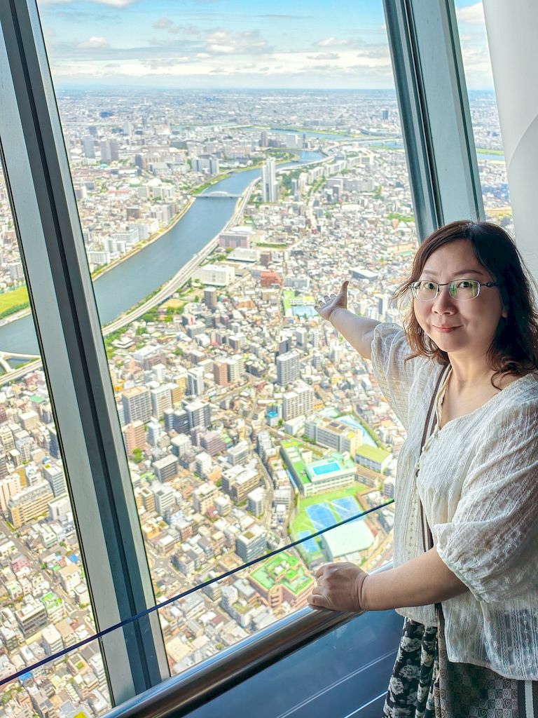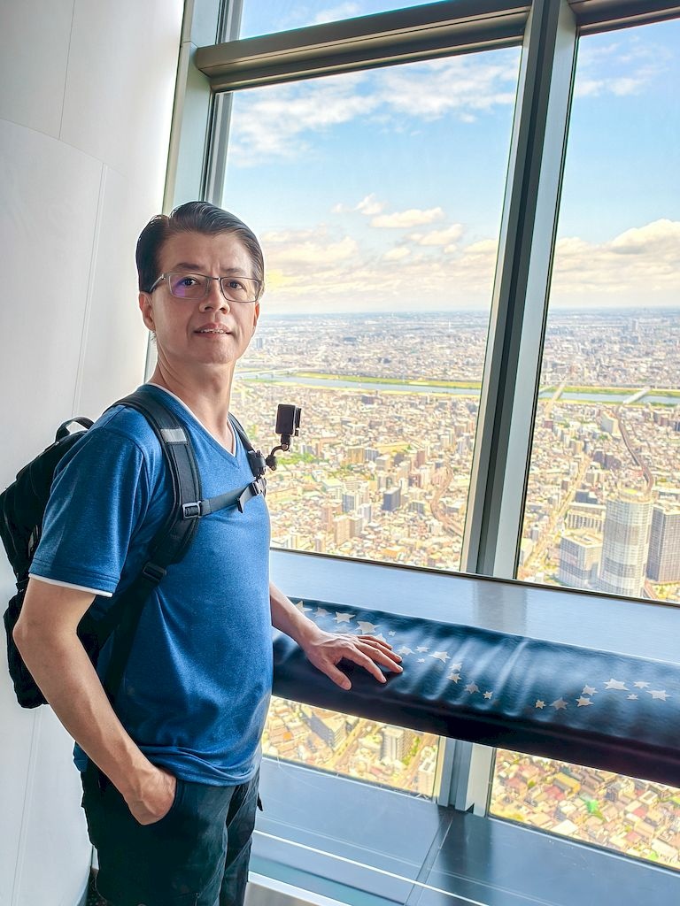 以往日本東京行程都是遠眺晴空塔,而這次行程終於隨團購票登上晴空塔,搭乘電梯直上350公尺高的第一展望台,登高眺望東京都密密麻麻的建築風光,都市文明盡收眼底。