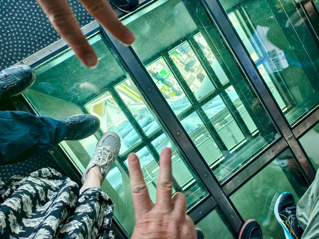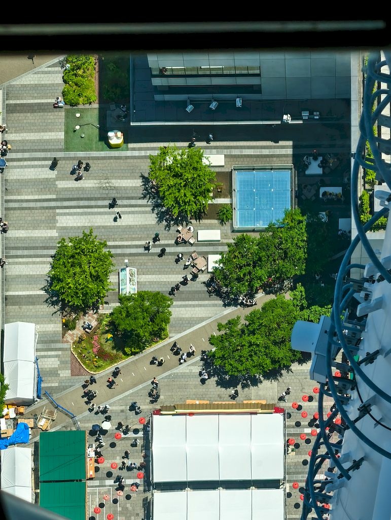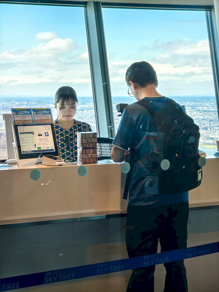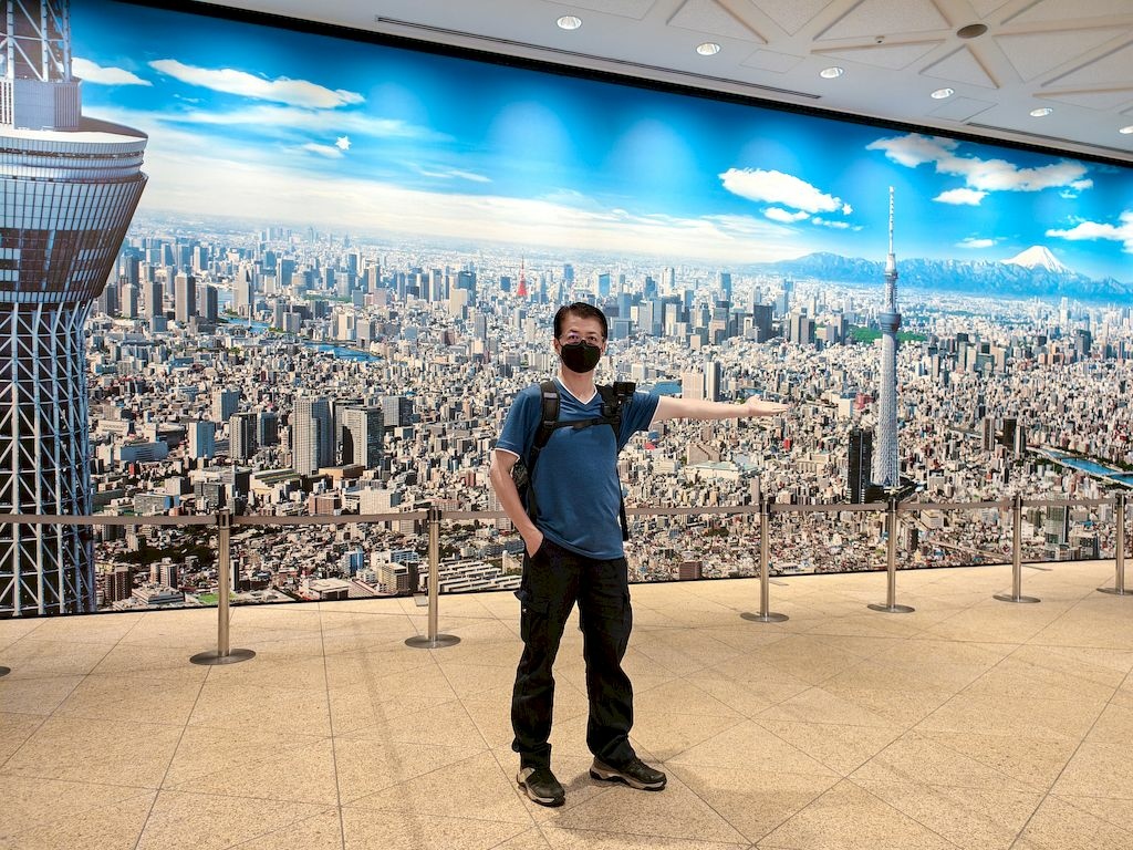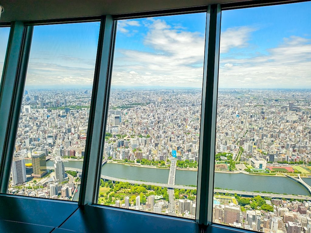 以往日本東京行程都是遠眺晴空塔,而這次行程終於隨團購票登上晴空塔,搭乘電梯直上350公尺高的第一展望台,登高眺望東京都密密麻麻的建築風光,都市文明盡收眼底。