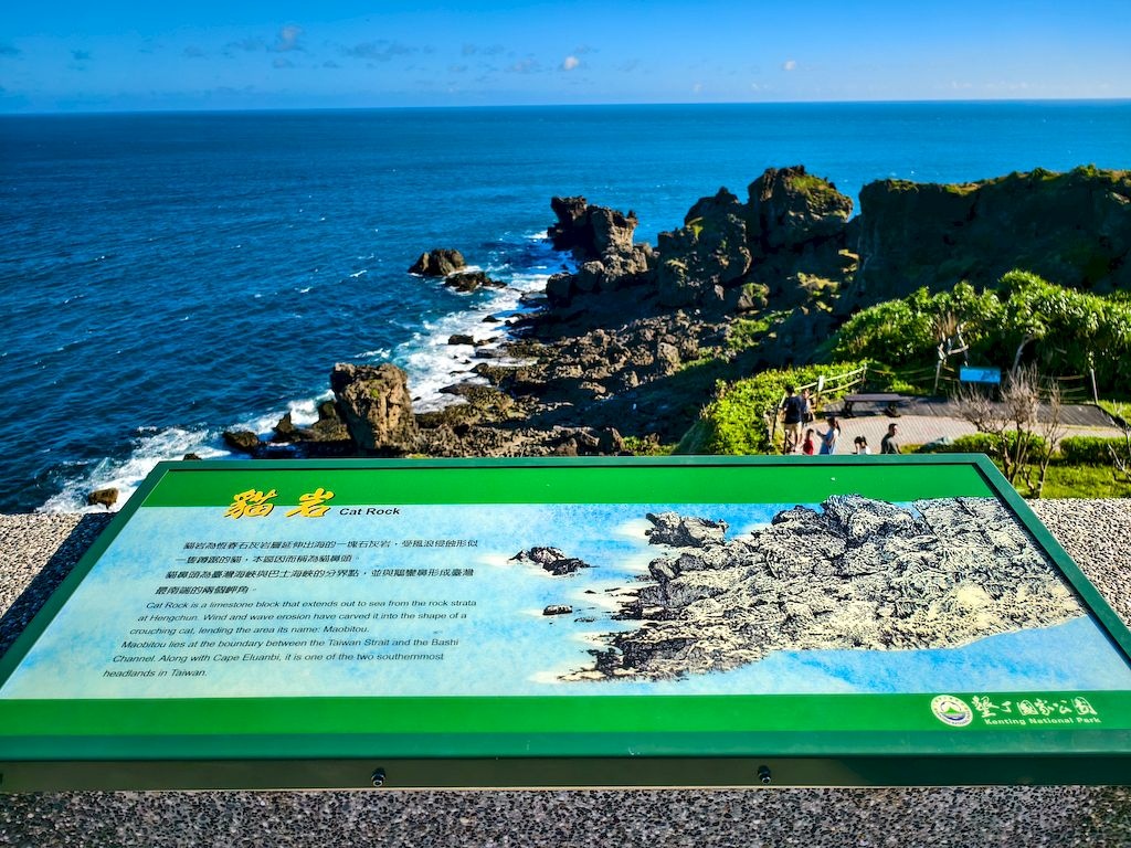 貓鼻頭因有一從海崖上滾落的珊瑚礁岩,其外形狀若蹲仆之貓而得名。貓鼻頭為臺灣海峽與巴士海峽的分界點,並與鵝鑾鼻形成臺灣最南之兩端。