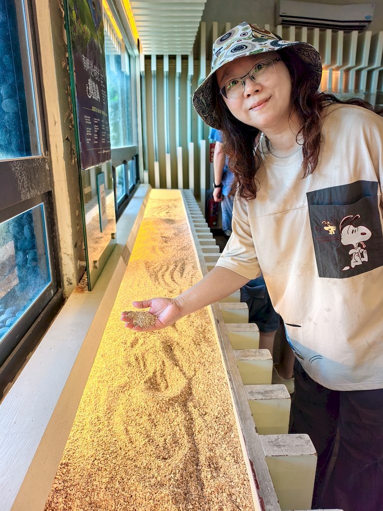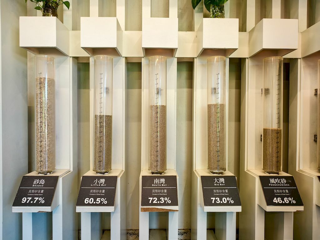 「砂島貝殼展示館」,貝殼砂(石灰質砂)是墾丁國家公園內沙灘中的主要組成物質,透過放大鏡觀察,個個晶瑩剔透、宛如珠玉。